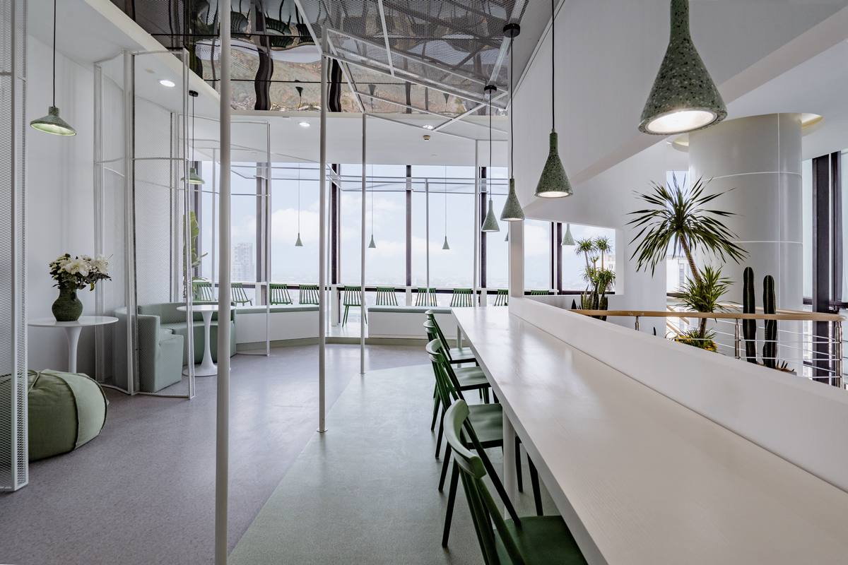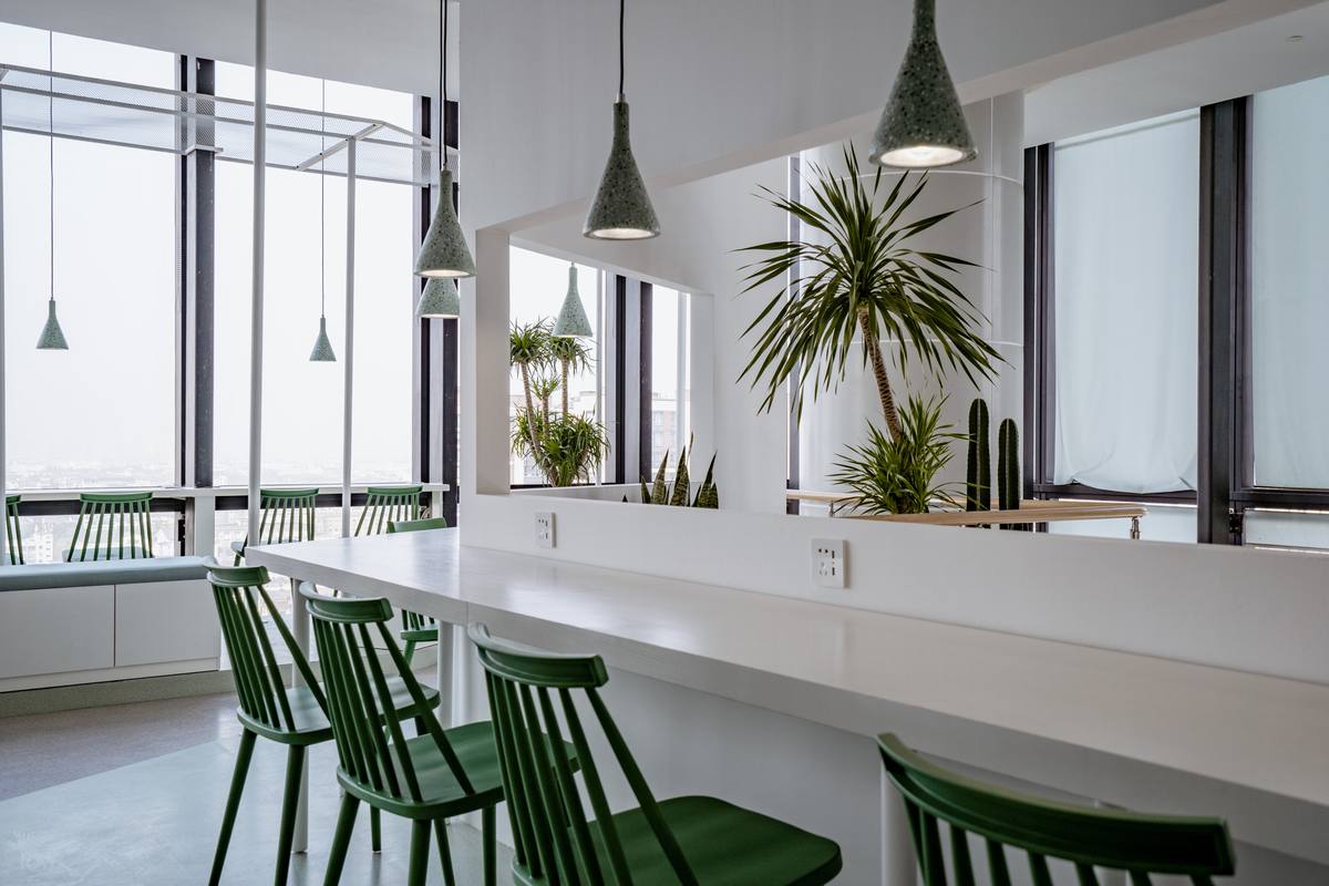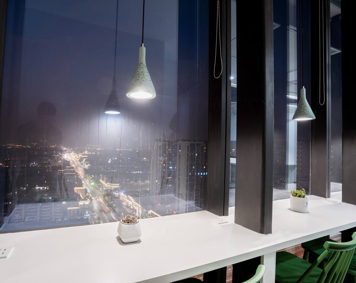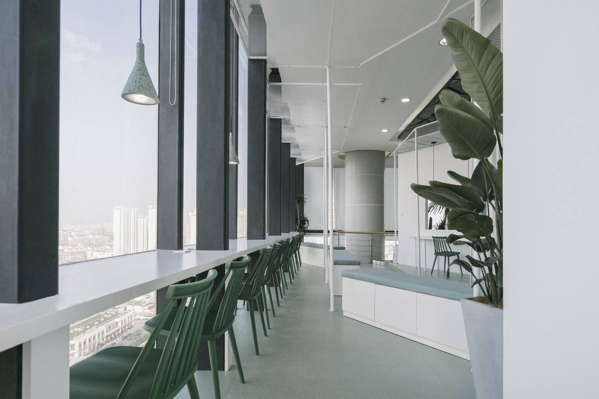云廊”空中自习室选址在车水马龙的苏州古城区与吴中区的交界处,傍晚华灯初上的时候,柠黄色的灯光映照在高耸的写字楼间,绵绵绿意掩映婆裟的灯影,勾勒出一方悠闲、惬意的静谧空间。整个项目在视线可达的范围之中,对整个姑苏老城的历史风韵、传统文脉呈俯瞰之姿。
